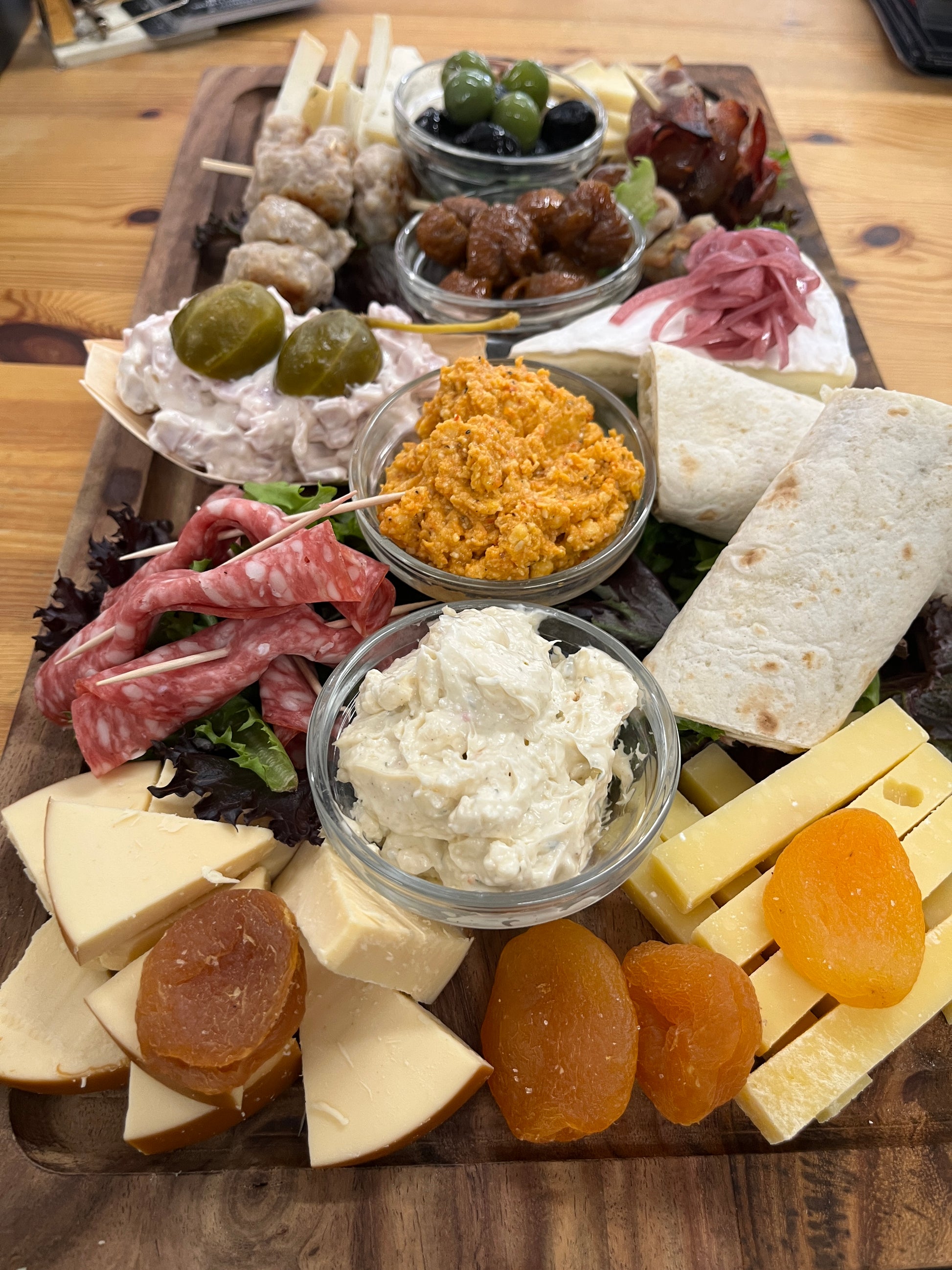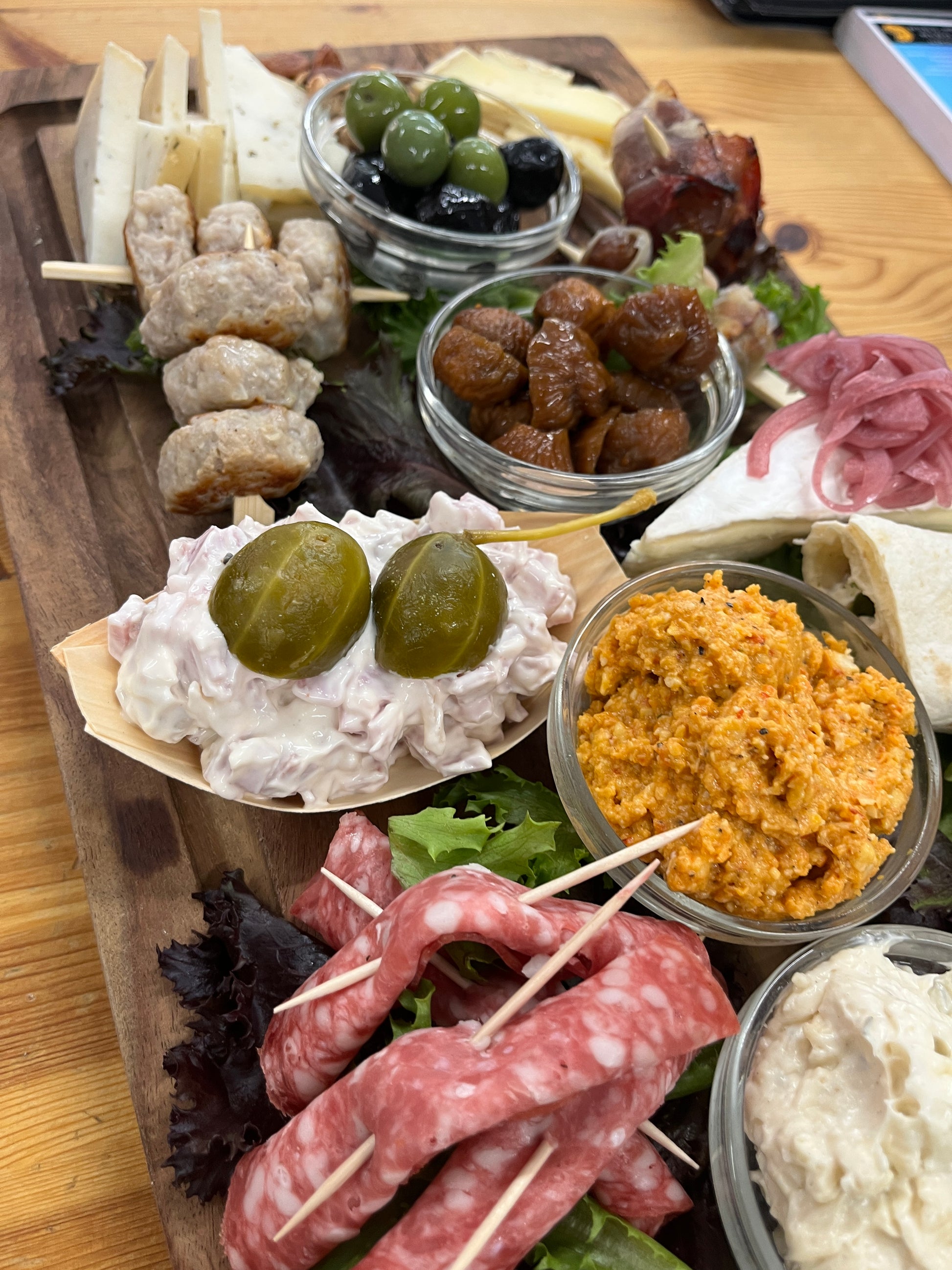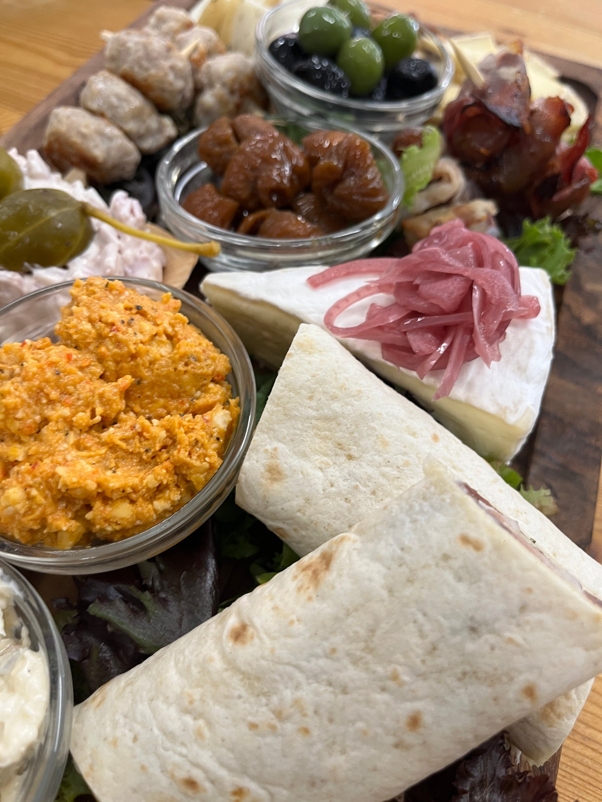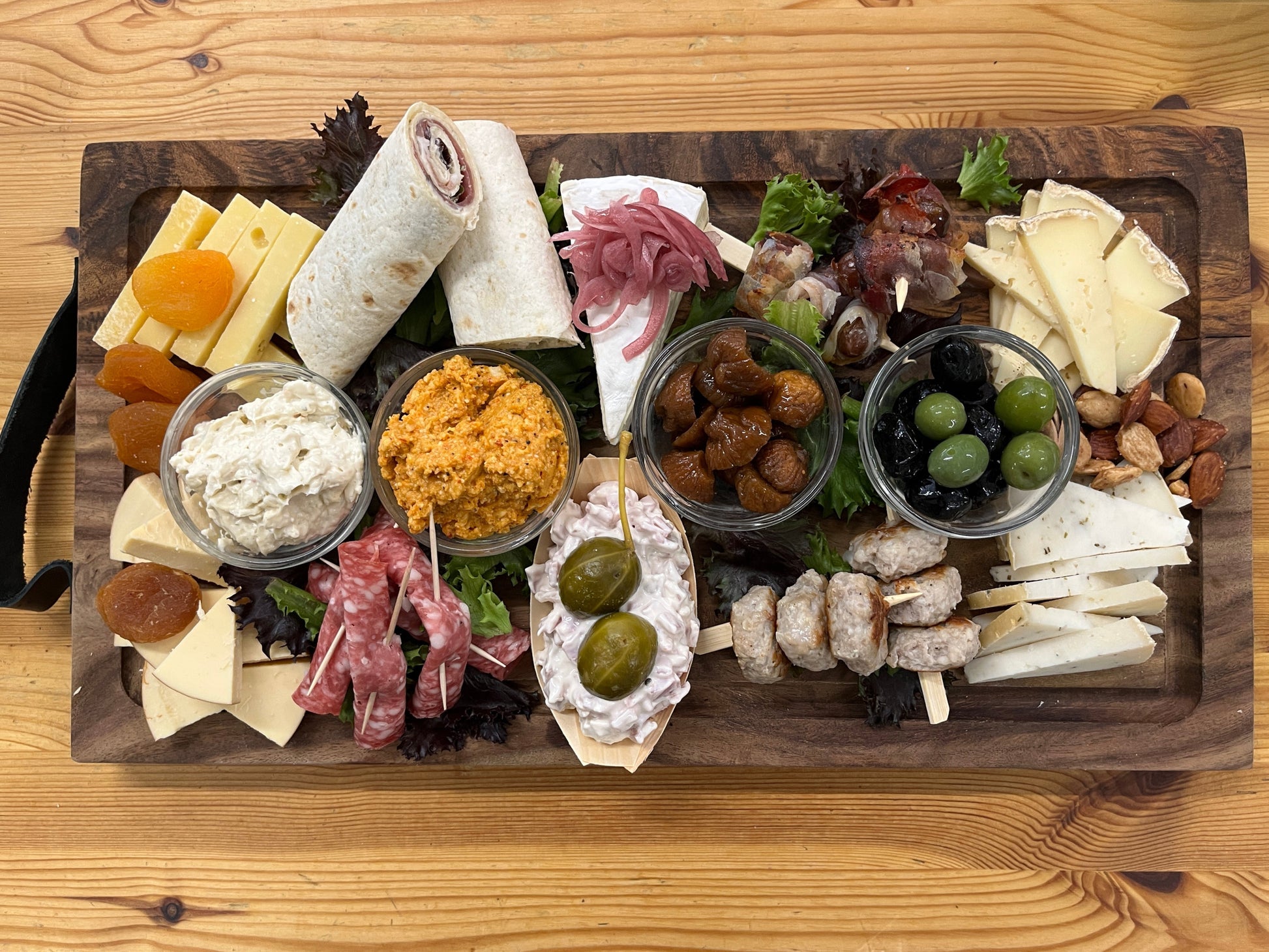 4 x CHARCUTERIE: Hjemmelavet lakserillette Minifrikadeller på spyd, Wraps med skinke, Salami i skiver og Dadler i bacon